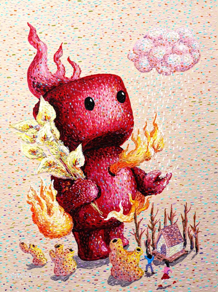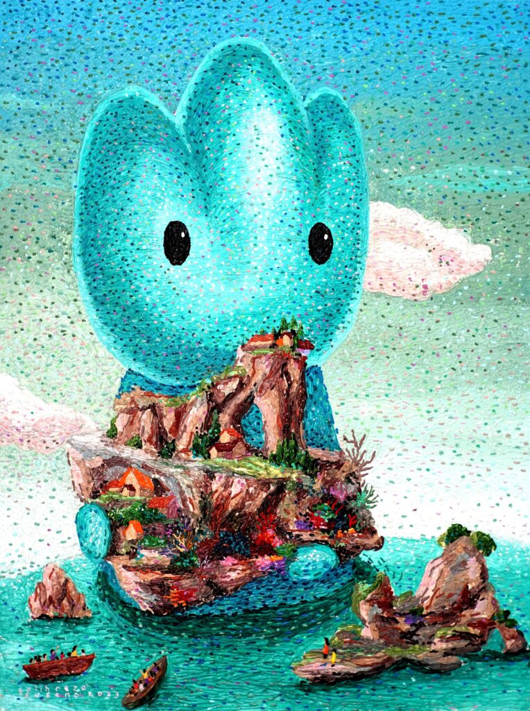 Javanese artist Galih’s concern with the environment sprung from the loss of his childhood village home to urbanisation. His works are fuelled by a sincere desire to reconcile the gap between humans and the natural environment. He yearns to rekindle the reverence humans once had for the earth. Specialising in acrylic and modelling paste, Galih’s oeuvre is reminiscent of the Pointillism movement when viewed from a distance. Close up, Galih’s lovable characters are immensely textured, reflecting his unique style of work.